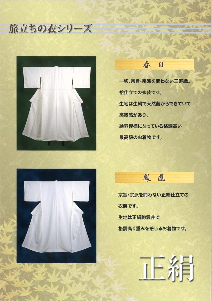 【春日】 一切、宗旨・宗派を問わない三寿織。給仕立ての衣装です。 生地は生絹で天然繭からできていて高級感があり、絵羽模様になっている格調高い最高級のお着物です。 【鳳凰】 宗旨・宗派を問わない正絹仕立ての衣装です。 生地は正絹駒雲井で格調高く重みを感じるお着物です。