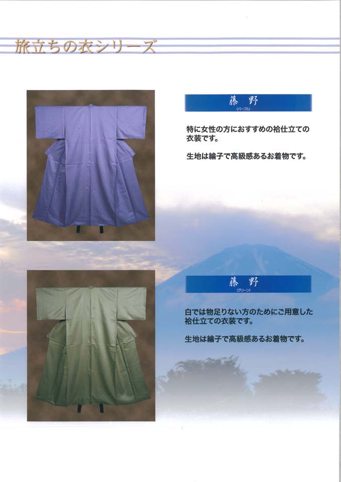【藤野(パープル)】 特に女性の方におすすめの給仕立ての衣装です。 生地は綸子で高級感があるお着物です。 【藤野(グリーン)】 白では物足りない方のためにご用意した給仕立ての衣装です。 生地は綸子で高級感があるお着物です。